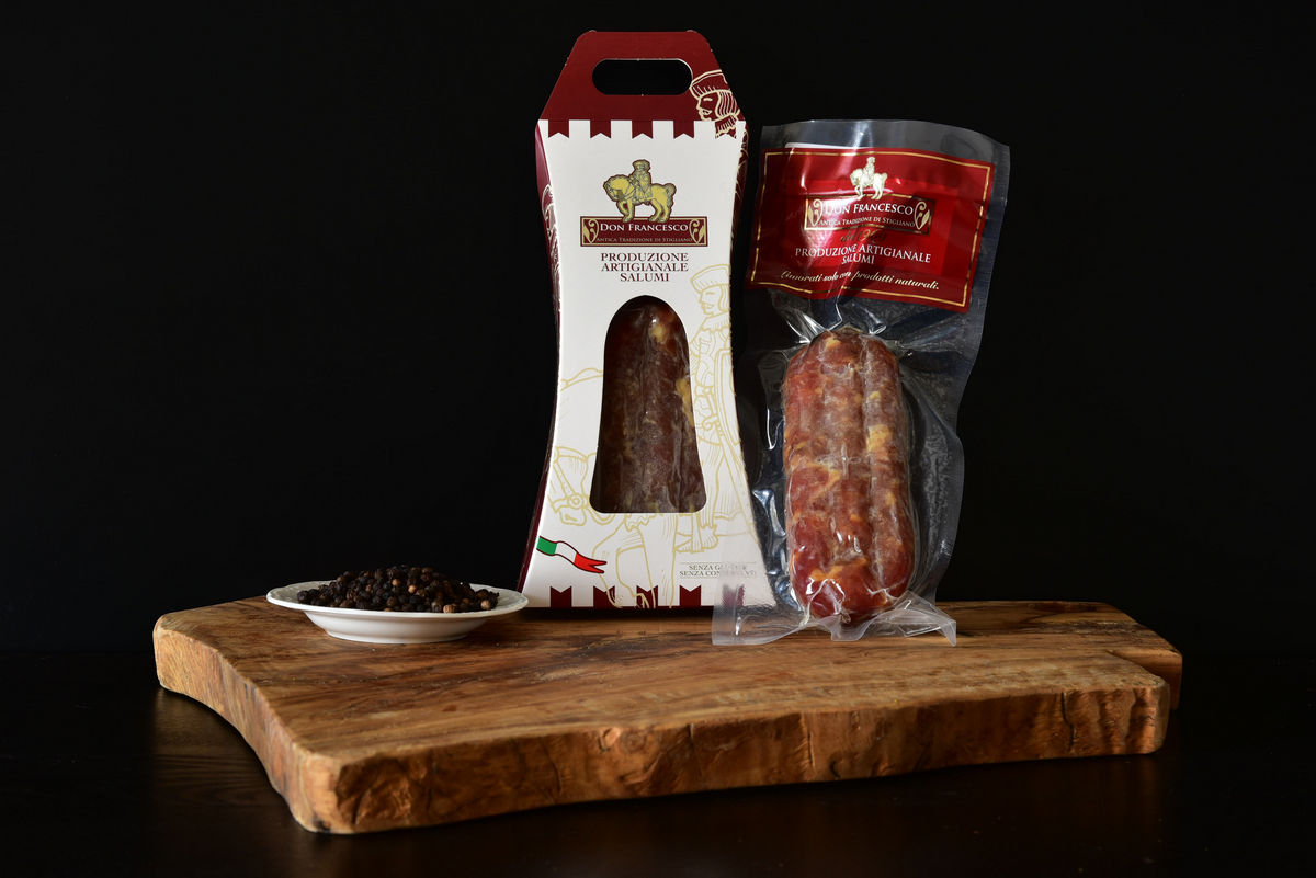 Carne di suino nero Lucano, sale, pepe in grani, racchiusa da budello naturale di suino.